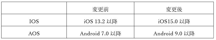 ※バージョン変更実施後は、iOS15.0、Android 9.0未満の端末では、新規インストール、アップデートができずアプリのご利用ができなくなる可能性があります。